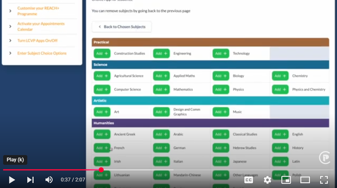 Watch our video below that talks you through adding your schools Leaving Cert subject options to this app in REACH: